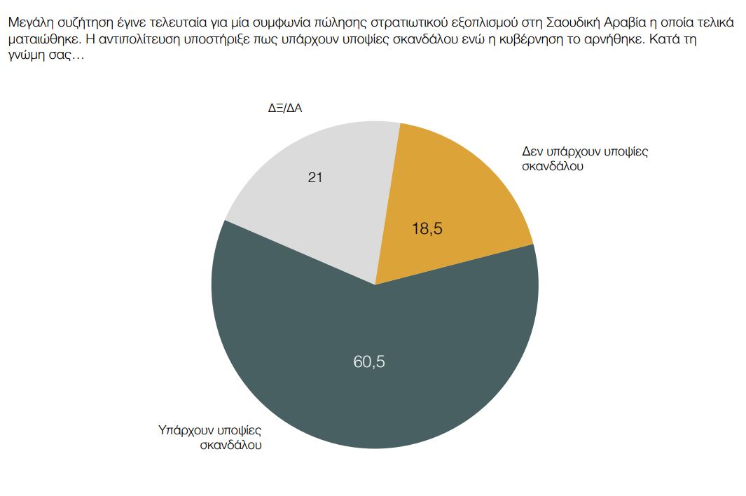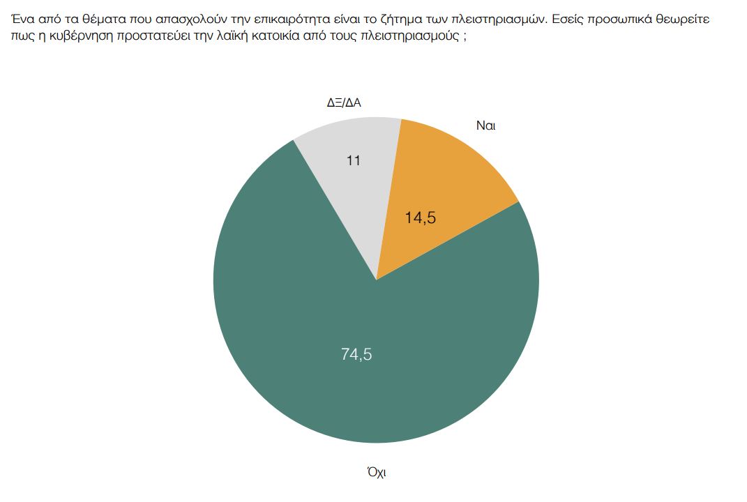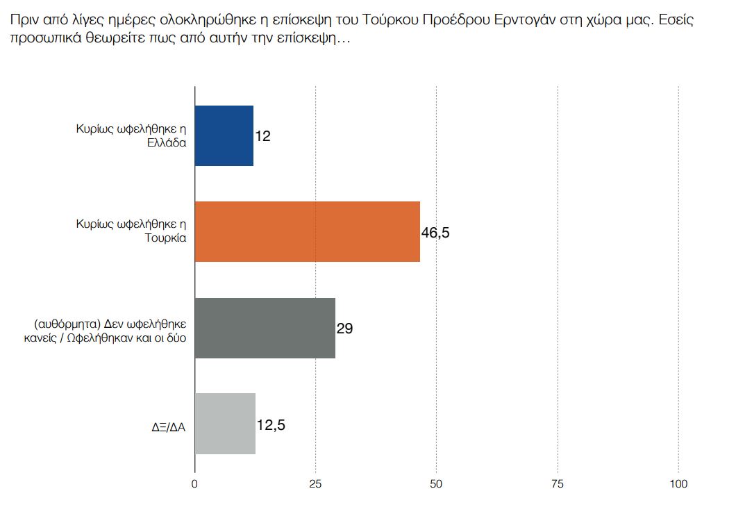 Στα ερωτήματα για την αποδοχή ή όχι του κυβερνητικού έργου, η πλειοψηφία (ποσοστό σχεδόν 75%) σημειώνει πως η κυβέρνηση δεν προστατεύει την πρώτη κατοικία, ενώ αναφορικά με την επίσκεψη του τούρκου προέδρου στην Ελλάδα ένα ποσοστό της τάξης του 46,5% εκτιμά ότι κυρίως ωφελήθηκε η Τουρκία.
