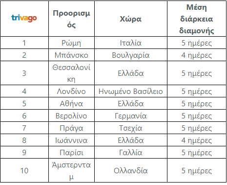 Τη δεκάδα συμπληρώνουν δημοφιλείς προορισμοί του εξωτερικού, και συγκεκριμένα το Λονδίνο, το Βερολίνο, η Πράγα, το Παρίσι, και το Άμστερνταμ.