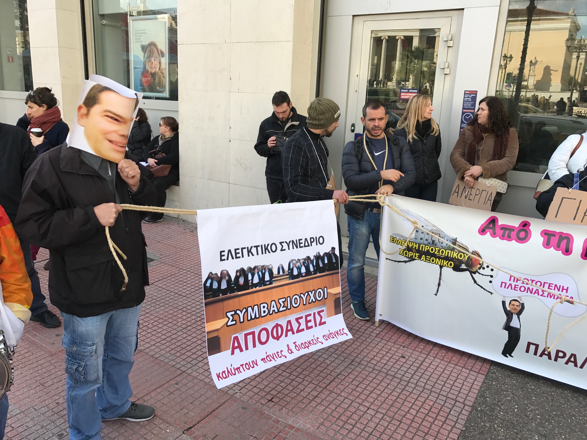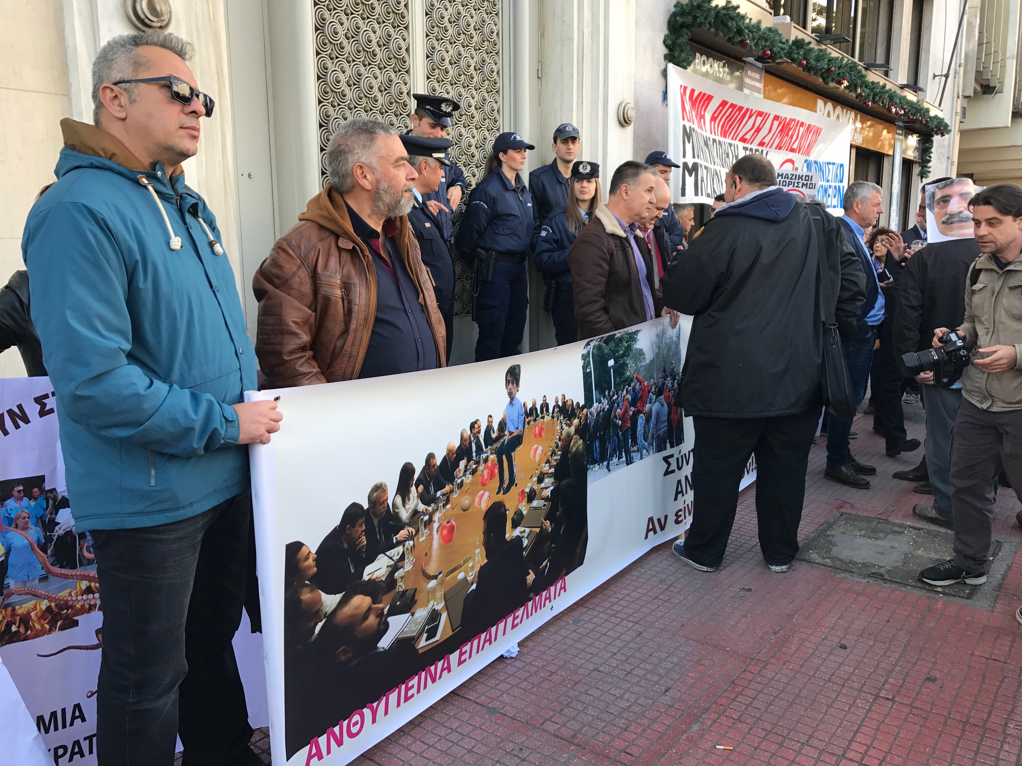 Οι συγκεντρωμένοι που απέκλεισαν για λίγη ώρα την κεντρική είσοδο του Γενικού Λογιστηρίου κρατούσαν πανό στα οποία απεικονίζονταν ο αναπληρωτής υπουργός Υγείας, Παύλος Πολάκης, ως ως «Πόντιος … Πολάκης» και αναγραφόταν η φραση «νίπτω τας χείρας μου».