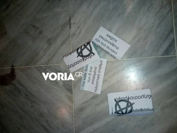 Σύμφωνα με πληροφορίες της voria.gr τα άτομα, που, όπως προκύπτει από τρικάκια που πέταξαν, ανήκουν στον αντιεξουσιαστικό χώρο, προκάλεσαν ζημιές σε γραφεία και ηλεκτρονικούς υπολογιστές και στη συνέχεια αποχώρησαν.
