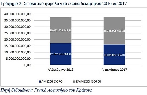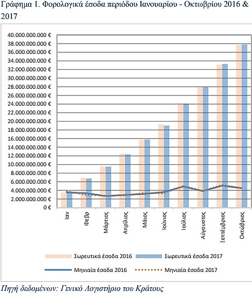 Αποτέλεσμα, για την περίοδο Ιανουαρίου – Οκτωβρίου 2017, τα σωρευτικά φορολογικά έσοδα να ανέρχονται σε 37,83 δισ. ευρώ, ελαφρώς αυξημένα σε σχέση με την αντίστοιχη περίοδο του 2016, όπου τα έσοδα ανέρχονταν σε 37,64 δισ. ευρώ.