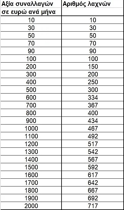 Το πλήθος των λαχνών προσδιορίζεται κλιμακωτά, με βάση το άθροισμα των ποσών που αντιστοιχούν στο σύνολο των συναλλαγών του μήνα στον οποίο αφορά η κλήρωση, ως εξής:
