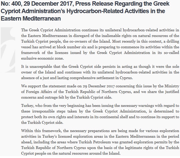 Κλιμακώνοντας την ένταση στην περιοχή, η Άγκυρα βάλλει κατά της Λευκωσίας κάνοντας λόγο για «μονομερείς δραστηριότητες» από την ελληνοκυπριακή πλευρά, η οποία «εξακολουθεί να ενεργεί σαν να ήταν ο μοναδικός ιδιοκτήτης του νησιού», ενώ προαναγγέλλει ανάλογες έρευνες στην Ανατολική Μεσόγειο, επικαλούμενη την εταιρεία «Τουρκικά Πετρέλαια».