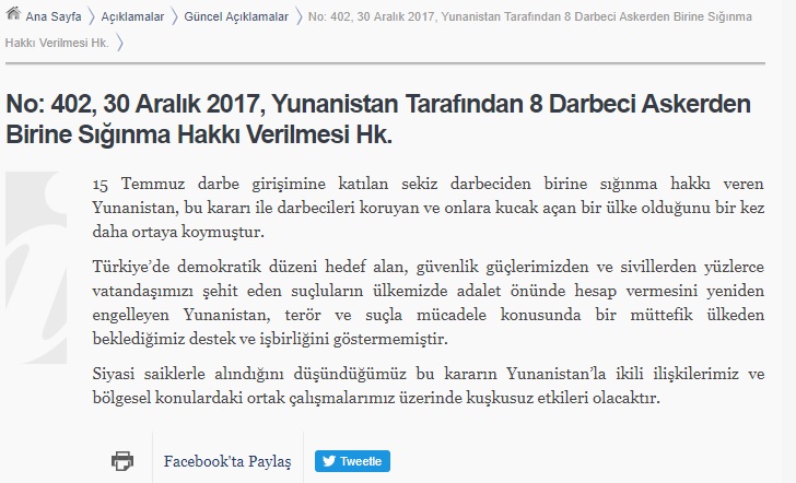 «Η Ελλάδα, που χορήγησε το δικαίωμα ασύλου σε έναν από τους οχτώ πραξικοπηματίες που συμμετείχαν στην απόπειρα πραξικοπήματος της 15ης Ιουλίου, για άλλη μια φορά απέδειξε ότι είναι μια χώρα που προστατεύει και έχει ανοίξει την αγκαλιά της σε πραξικοπηματίες με αυτή την απόφαση» τονίζει σε ανακοίνωσή του το τουρκικό υπουργείο Εξωτερικών.