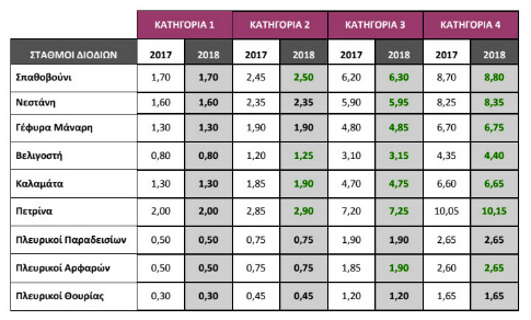 Ειδικότερα, πρόκειται για αυξήσεις της τάξης των 5 ή 10 λεπτών ανάλογα με τον τύπο του οχήματος για κάθε σταθμό διοδίων, με τις τιμές διέλευσης για τα δίκυκλα να παραμένουν σταθερές.