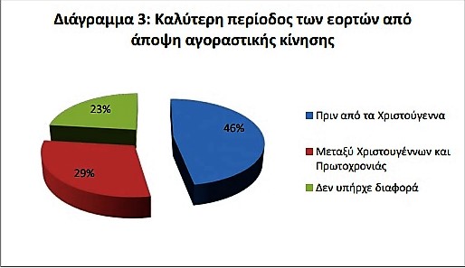 Η καλύτερη περίοδος των εορτών από άποψη αγοραστικής κίνησης, σύμφωνα με τη γνώμη των επιχειρηματιών λιανικού εμπορίου, ήταν η εβδομάδα πριν από τα Χριστούγεννα (46%), ενώ για ένα σημαντικό ποσοστό (29%), η εβδομάδα μεταξύ Χριστουγέννων και Πρωτοχρονιάς.