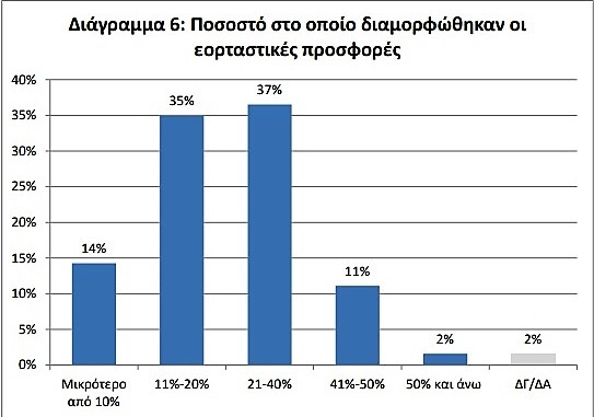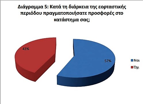 Σχεδόν οι 6 στους 10 επιχειρηματίες πραγματοποίησαν προσφορές στα καταστήματα τους κατά τη διάρκεια της εορταστικής περιόδου, ποσοστό σχεδόν διπλάσιο σε σύγκριση με πέρυσι. Συγκεκριμένα το 57% των επιχειρήσεων διέθεσαν κάποια από τα προϊόντα τους σε χαμηλότερες τιμές, ώστε να προσελκύσουν το καταναλωτικό κοινό.