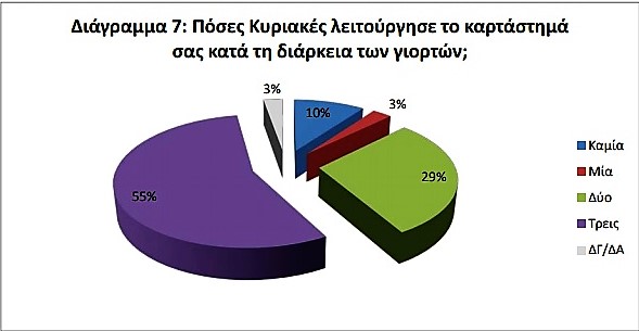 Ωστόσο, η πλειονότητα των εμπορικών επιχειρήσεων λειτούργησε το κατάστημά τους και τις τρεις Κυριακές κατά τη διάρκεια των εορτών. Ένας στους τρεις άνοιξε την επιχείρησή του δύο από τις τρεις Κυριακές και ένας στους δέκα είτε άνοιξε μία Κυριακή, είτε καμία.