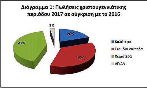 Για το 55% των επιχειρήσεων οι πωλήσεις είτε αυξήθηκαν είτε παρέμειναν στάσιμες, ενώ για το 42% των επιχειρήσεων οι πωλήσεις μειώθηκαν, ποσοστό που είναι όμως αισθητά μειωμένο, έναντι του αντίστοιχου ποσοστού το 2016 (76%).