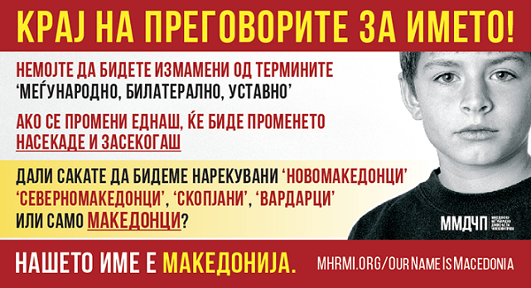Με δεκάδες γιγαντοαφίσες της εθνικιστικής αυτοαποκαλούμενης οργάνωσης «Μακεδονική Ένωση Ανθρωπίνων Δικαιωμάτων» (MHRMI) με μότο «Το όνομά μας είναι Μακεδονία» γέμισαν οι δρόμοι της πόλης των Σκοπίων, χαρακτηρίζοντας τις θέσεις της κυβέρνησης Ζάεφ «ρατσιστικές και αντιμακεδονικές».