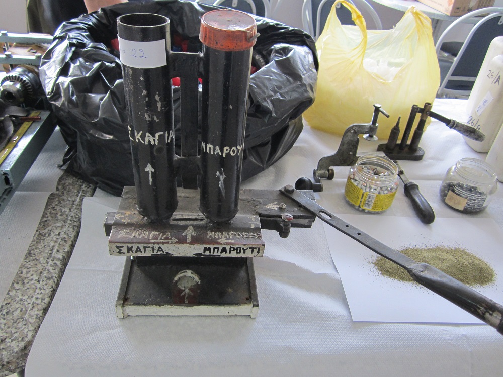 - Μία αυτοσχέδια μεταλλική συσκευή – δοσομετρητής γέμισης κυνηγετικών φυσιγγίων,