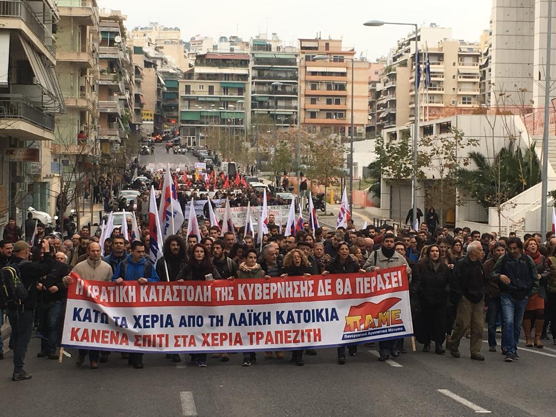 «Η κυβέρνηση ΣΥΡΙΖΑ-ΑΝΕΛ έρχεται να αρπάξει την κατοικία του λαού βήμα-βήμα. Προχωράει στους ηλεκτρονικούς πλειστηριασμούς, προχώρησε στην αυτεπάγγελτη δίωξη όποιων αγωνίζονται ενάντια στην αρπαγή της λαϊκής κατοικίας, και τώρα συνεχίζει παραπέρα βήματα στο να αρπάζει τη λαϊκή κατοικία όποιων χρωστάνε στο Δημόσιο» υποστήριξε το μέλος της εκτελεστικής γραμματείας του ΠΑΜΕ, Βάλσαμος Συρίγος.