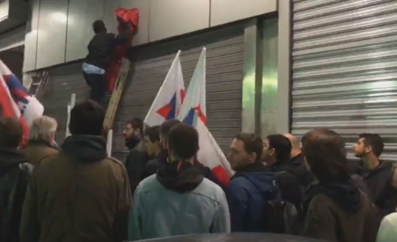 Οι δεκάδες συγκεντρωμένοι φωνάζουν συνθήματα και πετούν τρικάκια, ενώ μια διμοιρία των ΥΜΕΤ που βρισκόταν στο σημείο αποχώρησε προκειμένου να μην δημιουργηθεί ένταση.