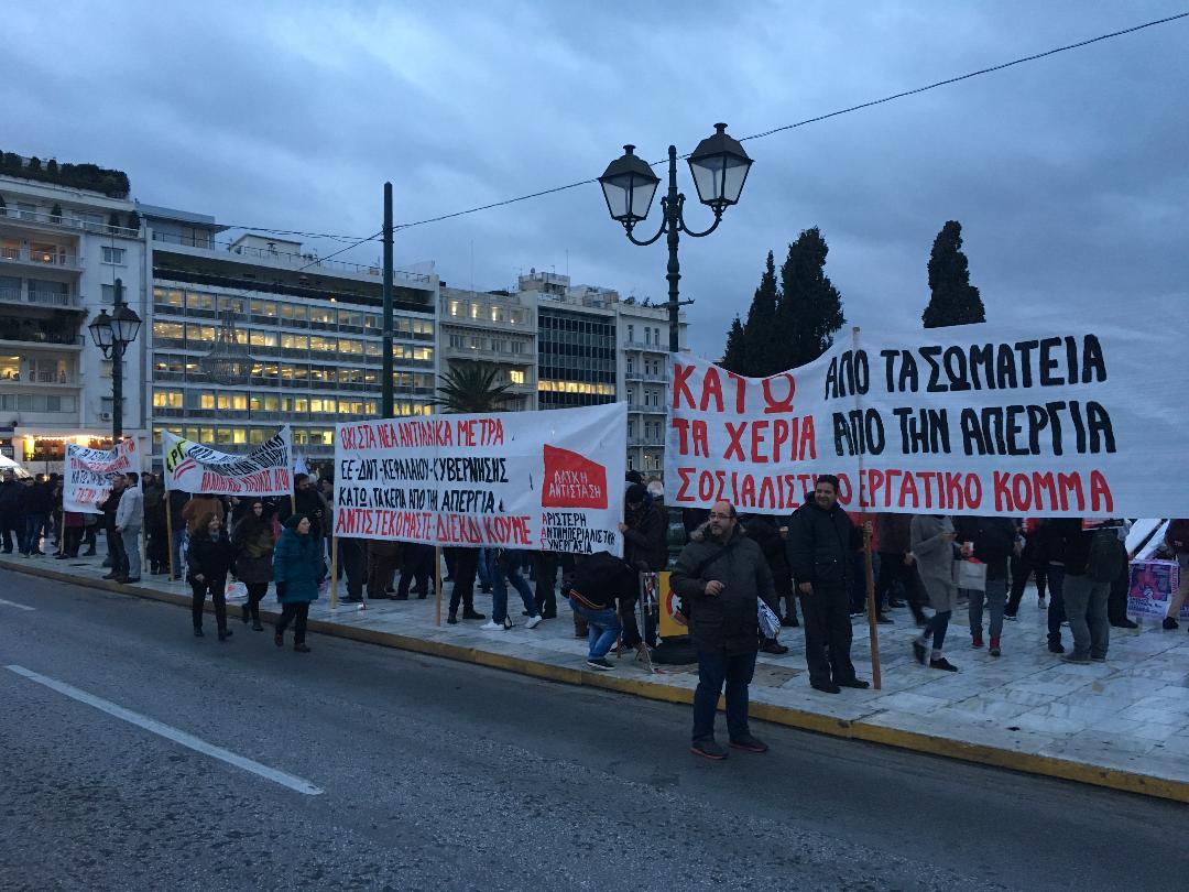 Ολοκληρώθηκαν οι απεργιακές κινητοποιήσεις σωματείων και εργαζομένων κατά του πολυνομοσχεδίου με τα προαπαιτούμενα για την ολοκλήρωση της γ' αξιολόγησης. Πορείες προς τη Βουλή πραγματοποίησαν ΑΔΕΔΥ, ΓΣΕΕ και ΠΑΜΕ. Κατά τη διάρκεια των συγκεντρώσεων, το βράδυ της Δευτέρας, προκλήθηκε ένταση όταν ομάδα αντιεξουσιαστών επιχείρησε να εισέλθει στο Κοινοβούλιο με αποτέλεσμα να συγκρουστεί με δυνάμεις των ΜΑΤ. Επεισόδια μικρής έκτασης σημειώθηκαν και λίγο αργότερα με μέλη της ΛΑΕ που προσπάθησαν να ανέβουν από το πλάι της Βουλής.