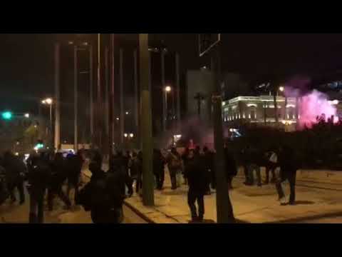 Οι αντιεξουσιαστές έριξαν βόμβες μολότοφ, μάρμαρα, μπογιές και πέτρες προς τις αστυνομικές δυνάμεις των ΜΑΤ που ήταν μπροστά από το μνημείο του Αγνώστου Στρατιώτη.