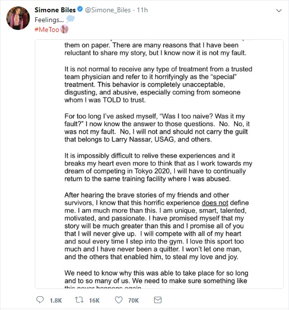 H 20χρονη γυμνάστρια πρόσθεσε: «Θα πρέπει να επιστρέφω συνεχώς στο ίδιο εκπαιδευτικό κέντρο όπου γνώρισα την κακοποίηση. Οι περισσότεροι από εσάς με ξέρετε ως ένα ευτυχισμένο, χαρούμενο και δυναμικό κορίτσι. Αλλά τον τελευταίο καιρό έχω αισθανθεί άσχημα και προσπαθώ περισσότερο να διώξω αυτές τις φωνές, που ακούγονται πιο δυνατά ως κραυγές. Δεν φοβάμαι να πω την ιστορία μου. Δεν είναι φυσιολογικό να λαμβάνεις κάθε είδους θεραπεία από έναν αξιόπιστο γιατρό στην ομάδα και να το βιώνεις τρομακτικά ως την «ειδική» θεραπεία».