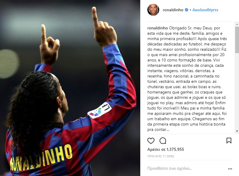 Με ένα συγκινητικό μήνυμα στα social media, ο Ροναλντίνιο οριστικοποίησε