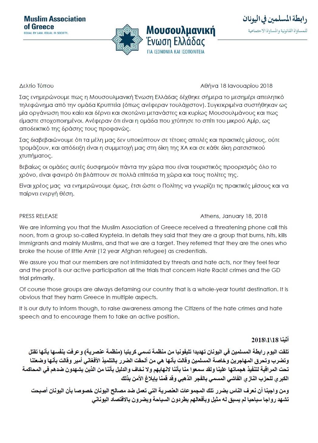 Όπως αναφέρει σε ανακοίνωσή της η Ένωση, στο τηλεφώνημα συστήθηκαν ως μία οργάνωση που καίει και δέρνει και σκοτώνει μετανάστες και κυρίως Μουσουλμάνους και πως η Ένωση είναι στοχοποιημένη.