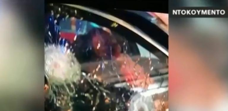 Το αυτοκίνητο έχει γαζωθεί από τις σφαίρες ενώ τα τζάμια είναι σπασμένα.