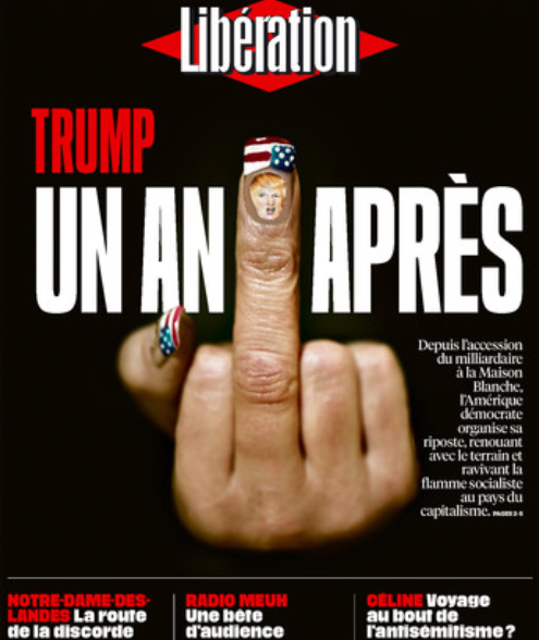 «Ντόναλντ Τραμπ, ένας χρόνος μετά» είναι ο τίτλος του πρωτοσέλιδου της εφημερίδας, το οποίο απεικονίζει ένα γυναικείο χέρι να σηκώνει το μεσαίο δάχτυλο, με νύχια βαμμένα στα χρώματα της αμερικανικής σημαίας, στα οποία εμφανίζεται ο Τραμπ.