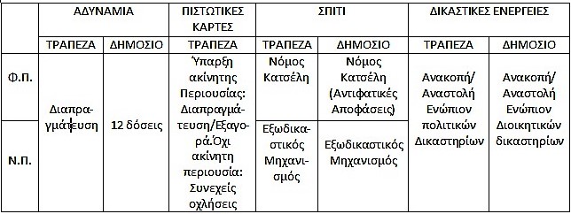 Νομικό πρόσωπο: Υπάρχει η δυνατότητα ένταξης στον εξωδικαστικό μηχανισμό, όπου θα γίνει μία συνολική ρύθμιση των οφειλών. Στη συνολική αυτή λύση θα πρέπει να ενταχθεί και η διάσωση της πρώτης κατοικίας του οφειλέτη, ακόμα και εάν αυτό θα σημάνει ρευστοποίηση άλλων περιουσιακών του στοιχείων.