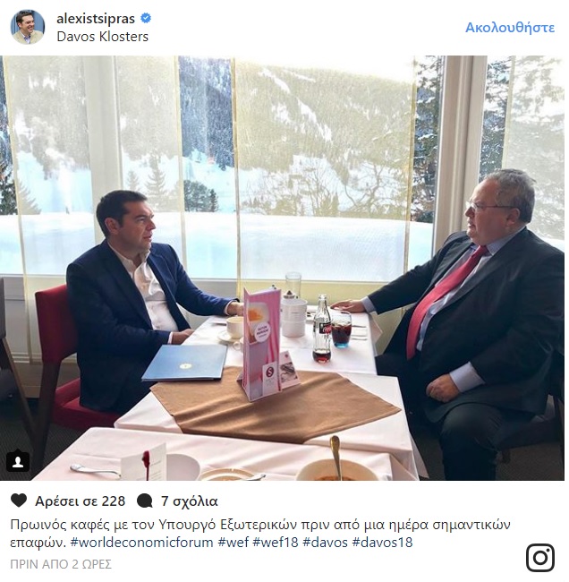 Τον πρωινό καφέ του «πριν από μια ημέρα σημαντικών επαφών», απόλαυσε ο Αλέξης Τσίπρας παρέα με τον Νίκο Κοτζιά την Πέμπτη με φόντο το χιονισμένο Νταβός, όπως φαίνεται από την ανάρτηση του ίδιου στον προσωπικό του λογαριασμό στο Instagram.
