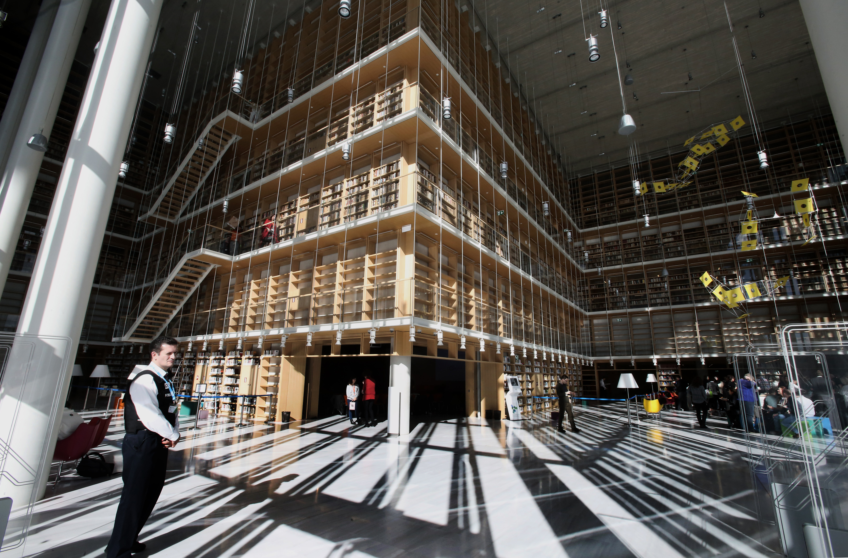 Μέσα στο γυάλινο κτίριο του Ρέντσο Πιάνο, το φυσικό φως διαχέεται στα πολύχρωμα έπιπλα, στον Πύργο Βιβλίων και στα αναγνωστήρια ώς τον σκληρό πυρήνα του κτιρίου, την Ερευνητική Εθνική Βιβλιοθήκη.