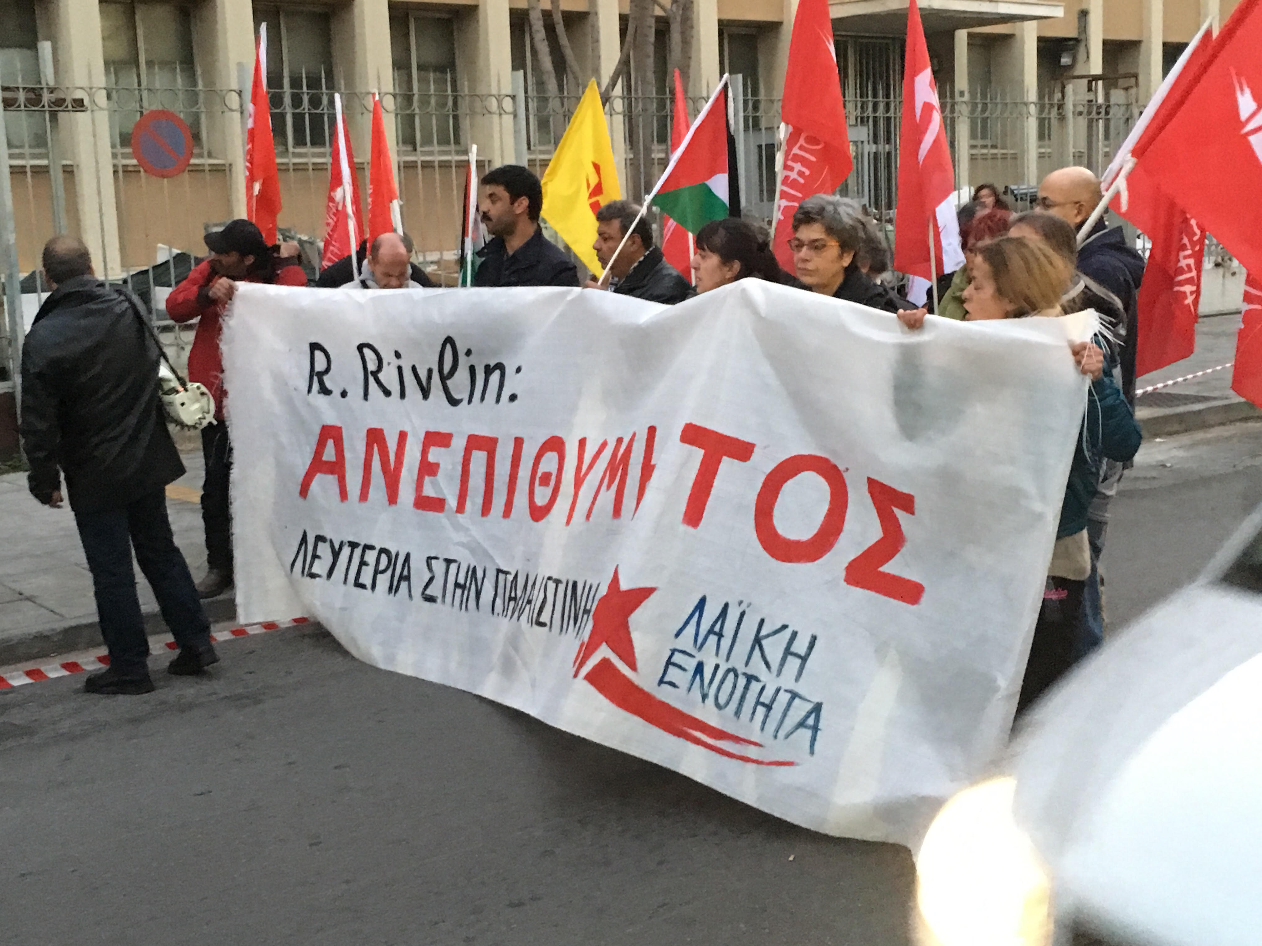 Οι συγκεντρωμένοι κρατούν πανό που χαρακτηρίζει «ανεπιθύμητο» τον πρόεδρο του Ισραήλ κ. Ρίβλιν και τη φράση «Λευτεριά στην Παλαιστίνη».