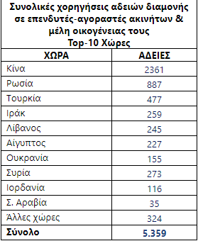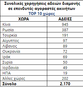 Αναφορικά με τις χώρες προέλευσης των επενδυτών, η Κίνα έρχεται πρώτη με 945 άδειες, ακολουθούμενη από τη Ρωσία με 387 και την Τουρκία με 191 να συμπληρώνει την πρώτη τριάδα, ξεπερνώντας την Αίγυπτο που ήταν στην τρίτη θέση.