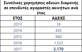 Ειδικότερα, σε ό,τι αφορά στην απόδοση του προγράμματος, σύμφωνα με τα πλέον πρόσφατα στοιχεία (που αφορούν την 30η/11/2017) που έλαβε ο οργανσιμός «Enterprise Greece» από την Γ.Γ. Μεταναστευτικής Πολιτικής, ο συνολικός αριθμός χορηγήσεων αδειών διαμονής σε επενδυτές-αγοραστές ακινήτων ανήλθε σε 2.170 από την έναρξή του το 2013 (ανάλυση του συνόλου των αδειών ανά χώρα προέλευσης στον πίνακα 1), ενώ όπως προκύπτει από τον πίνακα 2 για την συνολική εξέλιξη των χορηγήσεων αδειών διαμονής σε επενδυτές-αγοραστές από έτος σε έτος παρατηρείται διαρκής αύξηση, αφού το πρόγραμμα ξεκίνησε με 16 άδειες το 2013, οι οποίες έγιναν 435 το 2014, 940 το 2015 και 1.522 το 2016, καθώς αυτό γινόταν γνωστό στο ανάλογο επενδυτικό κοινό και μεγάλωνε η δυναμική του.