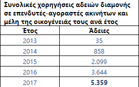 Σε ό,τι αφορά τη συνολική εξέλιξη των χορηγήσεων αδειών διαμονής σε επενδυτές-αγοραστές ακινήτων & τα μέλη της οικογένειας που τους συνοδεύουν, σύμφωνα με τον πίνακα 3 από έτος σε έτος σημειώνεται διαρκής αύξηση αφού το πρόγραμμα ξεκίνησε με 35 άδειες το 2013, συνέχισε με 858 το 2014, 2.099 το 2015 και 3.644 το 2016. Για το 2017 και μέχρι τις 30/11 είχαν καταγραφεί συνολικά 5.359 χορηγήσεις αδειών διαμονής σε επενδυτές-αγοραστές ακινήτων & μέλη της οικογένειας τους. Ανάλυση του συνόλου των χορηγήσεων αδειών ανά χώρα προέλευσης ακολουθεί στον πίνακα 4. Πίνακας 3
