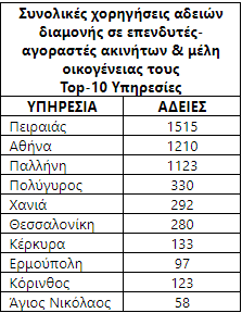 Σε σχέση με τις περιοχές στις οποίες πραγματοποιήθηκαν οι περισσότερες αγορές όπως φαίνεται και στον πίνακα 5 πρώτη σε αριθμό αδειών διαμονής έρχεται η Δ/νση Αλλοδαπών και Μετανάστευσης του Πειραιά με 566 άδειες και ακολουθούν η Δ/νση Αλλοδαπών και Μετανάστευσης Αθήνας με 467 άδειες και η Δ/νση Αλλοδαπών και Μετανάστευσης Παλλήνης με 466 άδειες. Οι υπόλοιπες υπηρεσίες που συμπληρώνουν τη δεκάδα είναι στον Πολύγυρο, τα Χανιά, τη Θεσσαλονίκη, τη Κέρκυρα, την Ερμούπολη, τη Κόρινθο και τον Άγιο Νικόλαο. Αν σε αυτές προστεθούν και οι συγγενείς των επενδυτών οι αριθμοί διαμορφώνονται ως εξής: Πειραιάς 1515 άδειες, Αθήνα 1210 άδειες, Παλλήνη 1123 άδειες (πίνακας 6). Πίνακας 5