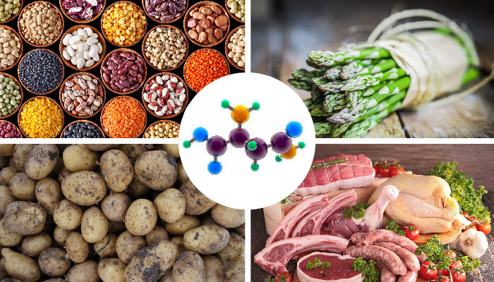 Η ασπαραγίνη περιέχεται σε πολλά τρόφιμα, όπως γαλακτοκομικά, μοσχαρίσιο κρέας, ορός γάλακτος, πουλερικά, αβγά, ψάρια, θαλασσινά, πατάτες, σπαράγγια, όσπρια, ξηροί καρποί, σπόροι, σόγια και δημητριακά ολικής άλεσης. Σε μικρές ποσότητες εμπεριέχεται επίσης σε όλα σχεδόν τα φρούτα και τα λαχανικά.