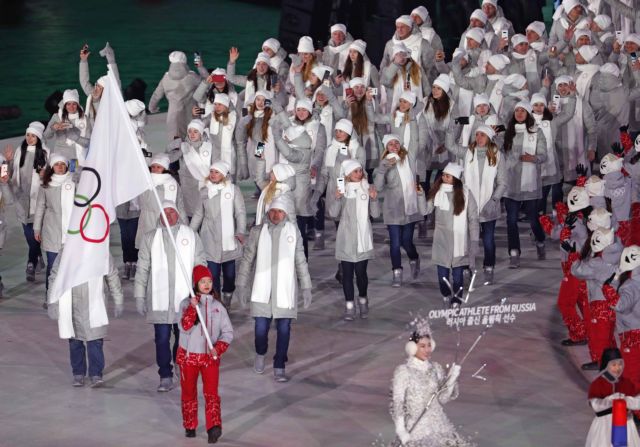 Η ομάδα της Ρωσίας παρήλασε με την Ολυμπιακή σημαία, ενώ τελευταίες μπήκαν μαζί στο «PyeongChang Olympic Stadium» οι αποστολές της Νότιας και της Βόρειας Κορέας υπό την σημαία της κορεατικής ενοποίησης.