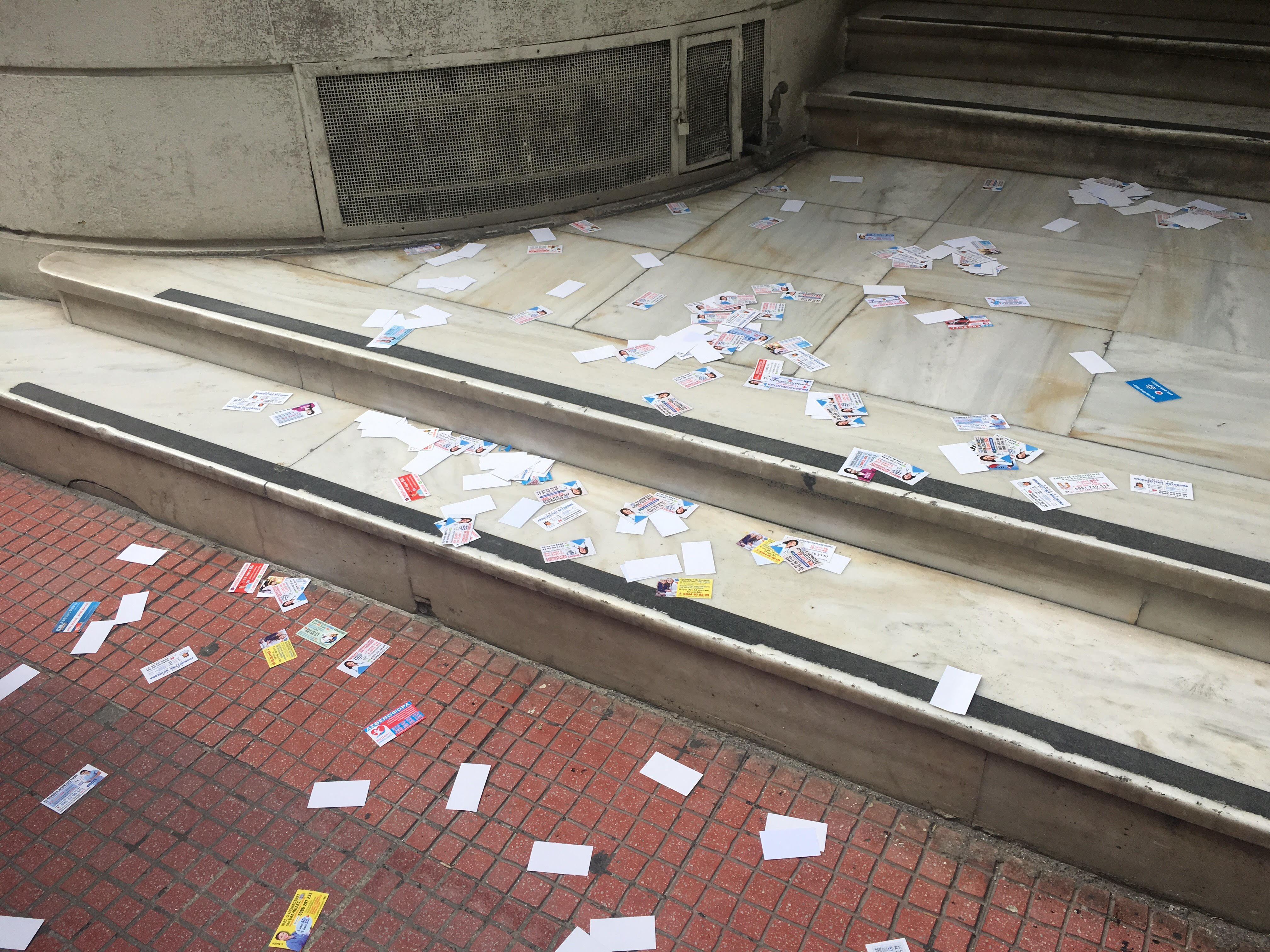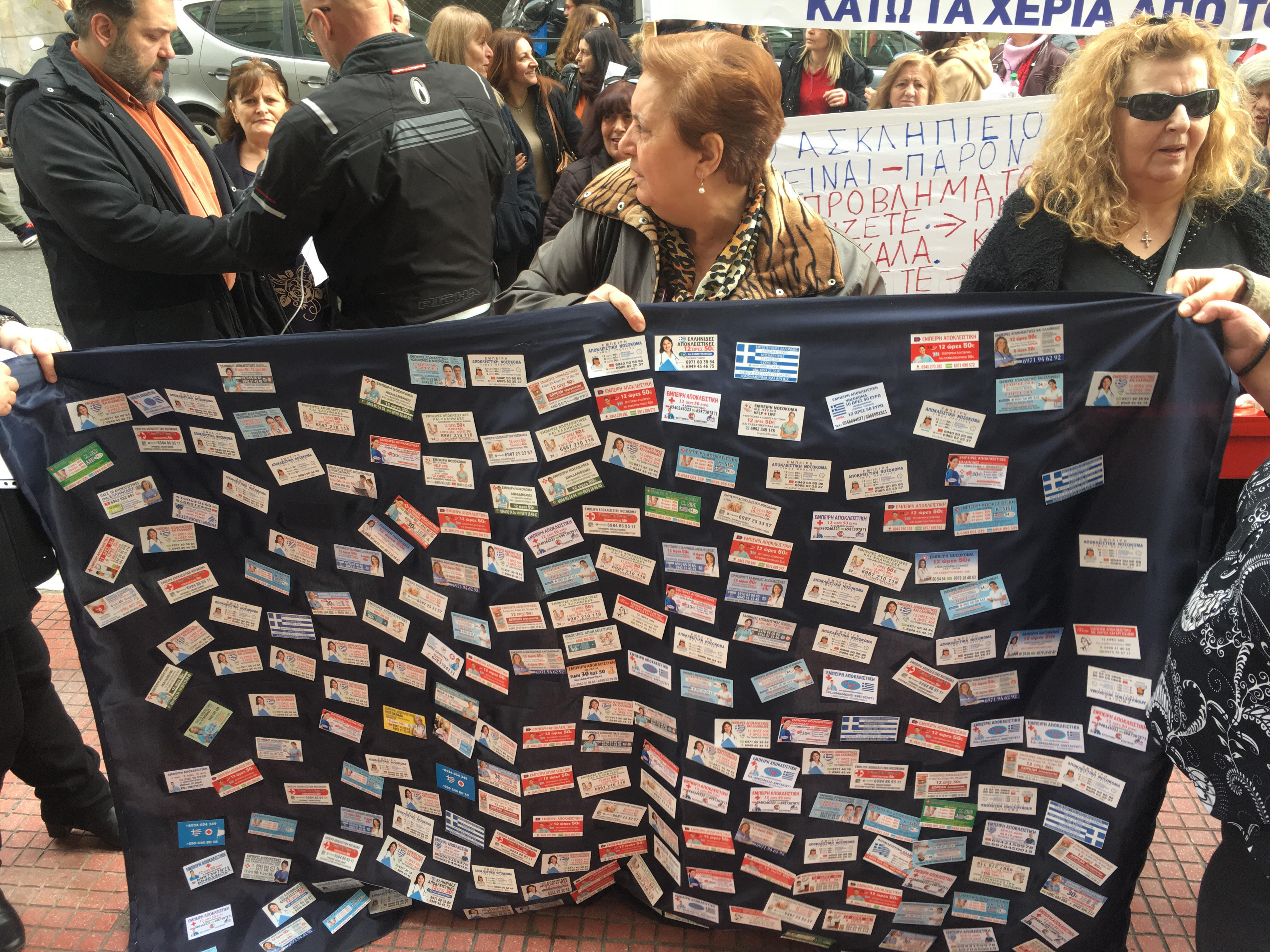 Με συνθήματα και πανό ζητούν συνάντηση με τον υπουργό Υγείας ενώ πετούν στα σκαλιά του υπουργείου δεκάδες κάρτες από παράνομες εταιρείας με αποκλειστικές νοσοκόμες.