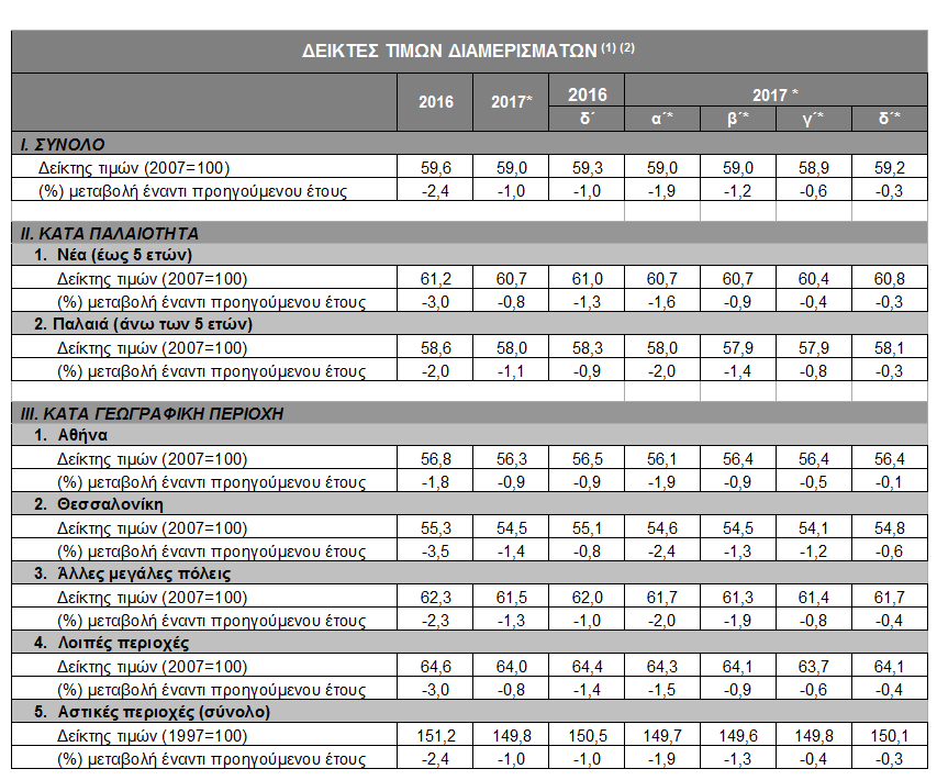 Τέλος, για το σύνολο των αστικών περιοχών της χώρας, το δ΄ τρίμηνο του 2017 οι τιμές των διαμερισμάτων υποχώρησαν οριακά κατά 0,3% σε σύγκριση με το δ΄ τρίμηνο του 2016, ενώ για το 2017 η μέση ετήσια μείωση διαμορφώθηκε σε 1,0%.