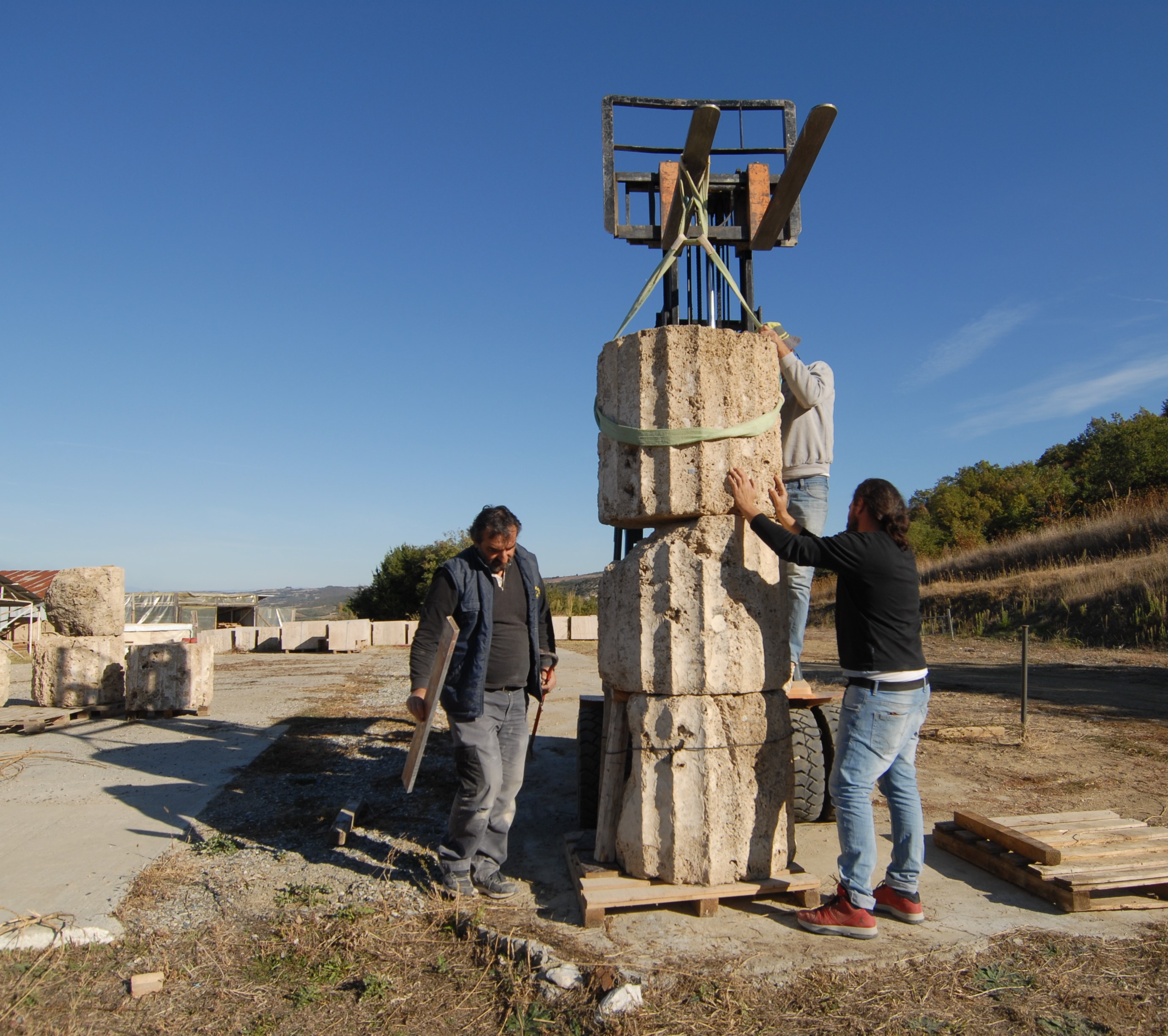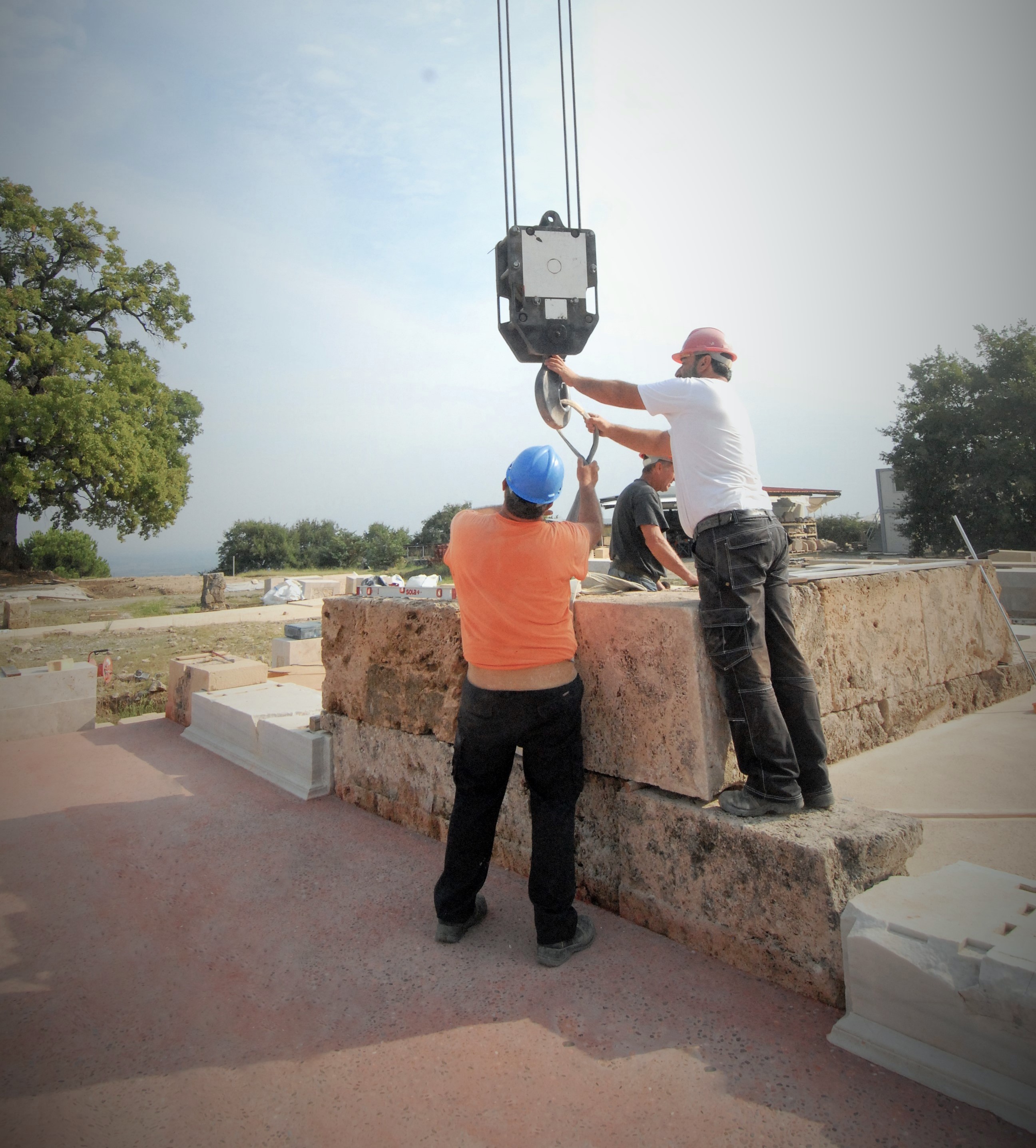 Παράλληλα ξεκίνησε η κατασκευή των περίπου 7.000 λίθινων πλίνθων, που έχουν μήκος γύρω στο ένα μέτρο, ύψος μισό και πλάτος 60 με 70 εκατοστών, οι οποίοι θα χρησιμοποιηθούν μαζί με τους αρχαίους που διατηρήθηκαν, για την ανακατασκευή του τεράστιου αναλήμματος, επάνω στο οποίο εδράζεται το μνημείο. Οι επιφάνειες όλων αυτών των λίθων διαμορφώνονται από τους τεχνίτες με το χέρι και τα εργαλεία είναι αντίστοιχα με αυτά που χρησιμοποιούνταν στην αρχαιότητα.