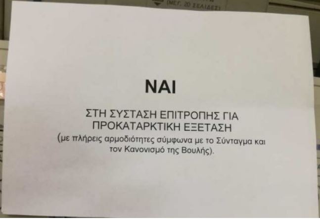 «Ναι στη σύσταση Επιτροπής Προκαταρκτικής Εξέτασης (με πλήρεις αρμοδιότητες σύμφωνα με το Σύνταγμα και τον Κανονισμό της Βουλής)», θα αναφέρει το χαρτί που θα ρίξουν στις κάλπες οι βουλευτές των δύο κομμάτων.