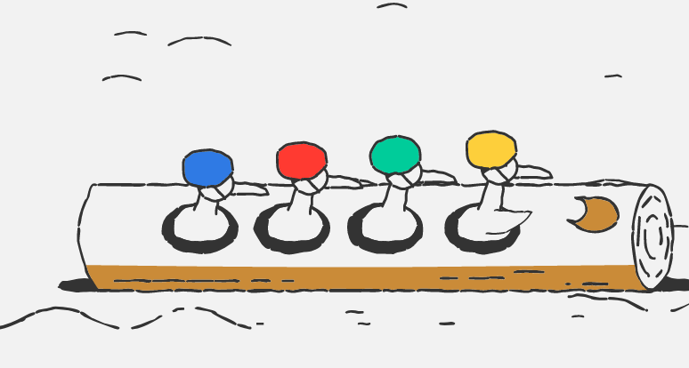 Τέσσερις πάπιες φορούν τα κράνη τους και έχουν πάρει θέση μέσα στο κορμό ενός δέντρου που αποτελεί και το όχημά τους. Εμφανίζονται έτοιμες να ξεκινήσουν την κούρσα τους και να πάρουν τη νίκη.