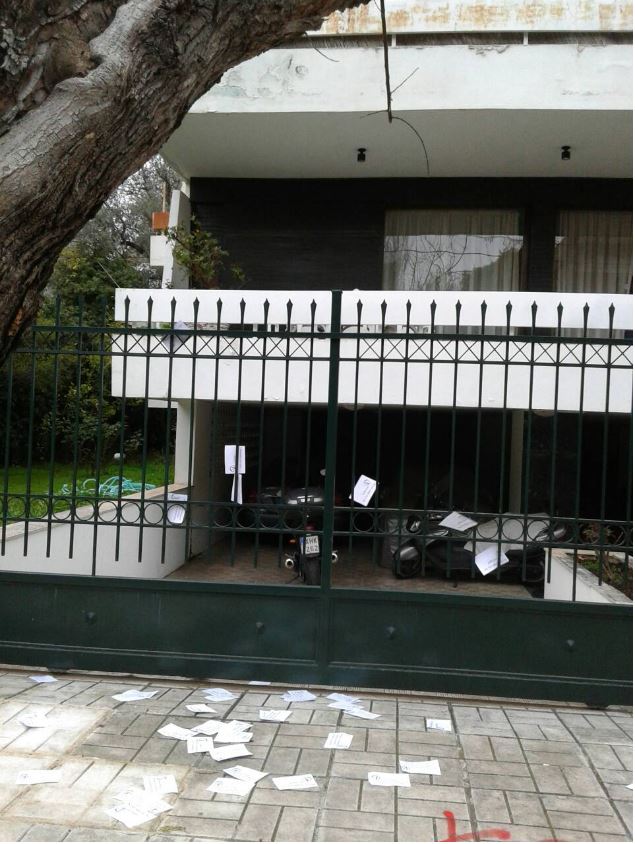 Παράσταση διαμαρτυρίας έξω από το σπίτι του πρώην πρωθυπουργού Λουκά Παπαδήμου, στο Παλαιό Ψυχικό, ως ένδειξη αλληλεγγύης για τη μεταγωγή του Κωνσταντίνου Γιατζόγλου, ο οποίος κρατείται στις φυλακές για την αποστολή του τρομοδέματος στον κ. Παπαδήμο, πραγματοποίησε ομάδα αντιεξουσαστών το απόγευμα της Κυριακής.