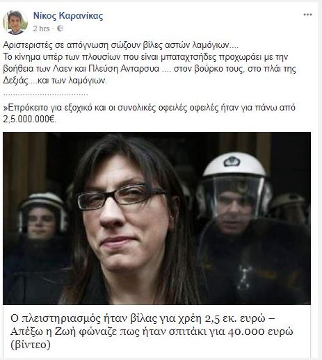 Το πρωί της Κυριακής, ο Νίκος Καρανίκας ανέβασε είδηση στο προφίλ του, που έλεγε πως ο πλειστηριασμός που απέτρεψε η Ζωή Κωνσταντοπούλου την περασμένη εβδομάδα ήταν για μία βίλα και χρέη 2,5 εκατ. ευρώ, και σχολίασε: «Αριστεριστές σε απόγνωση σώζουν βίλες αστών λαμόγιων…. Το κίνημα υπέρ των πλουσίων που είναι μπαταχτσήδες προχωράει με την βοήθεια των Λαεν και Πλεύση Ανταρσυα…. στον βούρκο τους, στο πλάι της Δεξιάς….και των λαμόγιων».