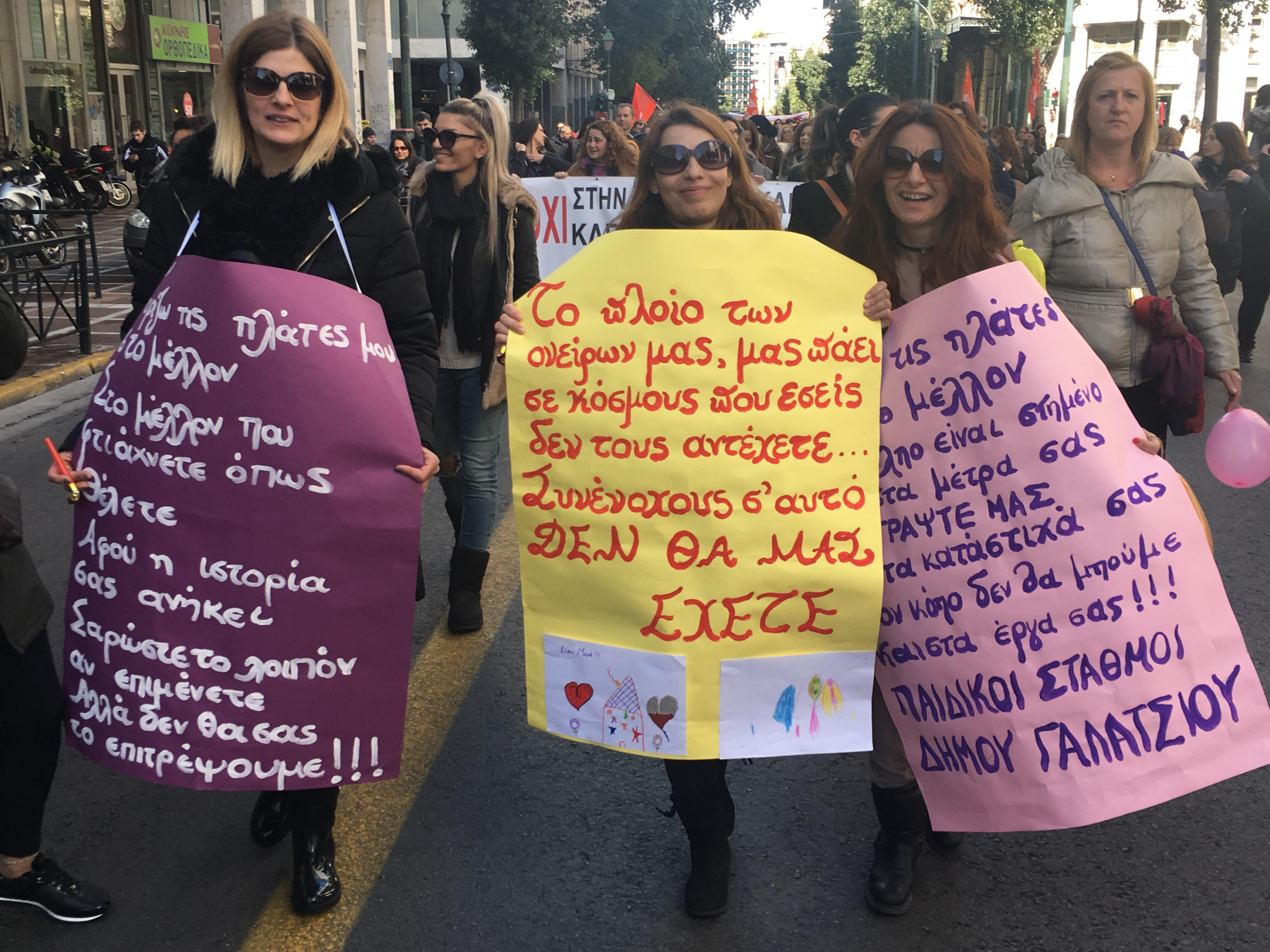 Νωρίτερα, πορεία από την πλατεία Καραϊσκάκη προς τη Βουλή πραγματοποίησαν βρεφονηπιαγωγοί, στο πλαίσιο κινητοποίησης της ΚΕΔΕ και της ΠΟΕ-ΟΤΑ, ενάντια στην υποχρεωτική ένταξη στα νηπιαγωγεία από την ηλικία των τεσσάρων ετών.