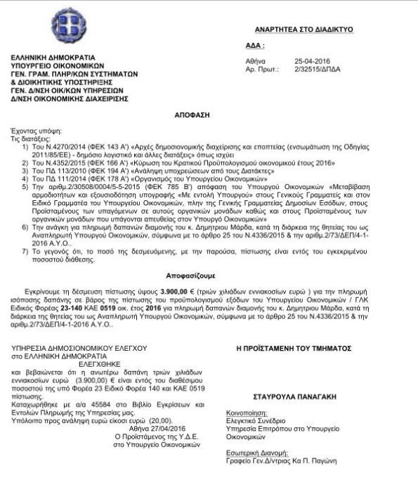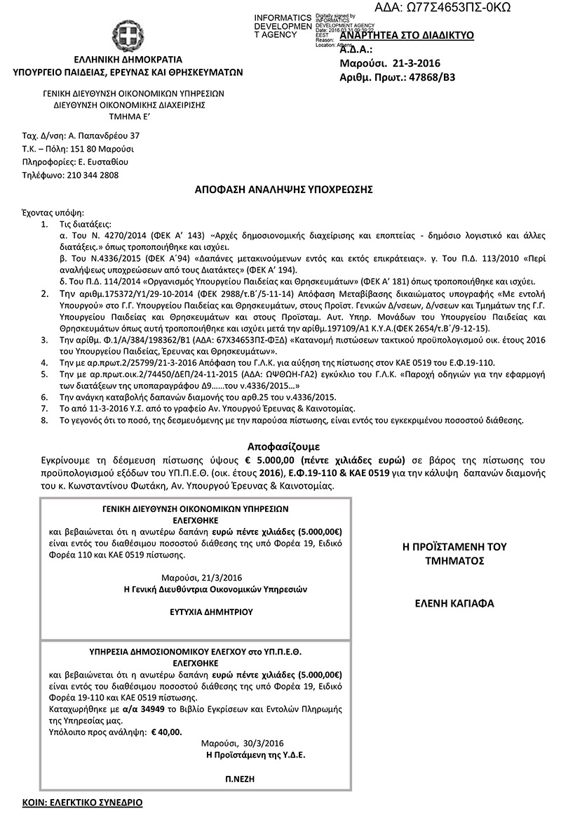 Ο ΣΚΑΙ παρουσίασε έγγραφο με πίστωση 5.000 ευρώ για κάλυψη δαπανών διαμονής του κ. Φωτάκη.