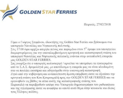 «Στις 17:00 η ώρα αρχίζω απεργία πείνας και παραμένω στον 5ο όροφο του υπουργείο διαμαρτυρόμενος για την επαναλαμβανόμενη αρνητική και καταστροφική στάση του υπουργού Ναυτιλίας και Νησιωτικής πολιτικής ενάντια στην ακτοπλοϊκή εταιρεία μας Golden Star Ferries» προσθέτει, ενώ συνεχίζει: