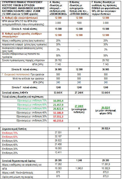 Αναλυτικά, για εργασίες ενεργειακής αναβάθμισης καθαρής αξίας 25.000 ευρώ (12.500 ευρώ κόστος υλικών και 12.500 ευρώ καθαρή αμοιβή εργασίας) το τελικό κόστος αφού προστεθούν οι φορολογικές, ασφαλιστικές κλπ, επιβαρύνσεις διαμορφώνεται στα 53.645 ευρώ.
