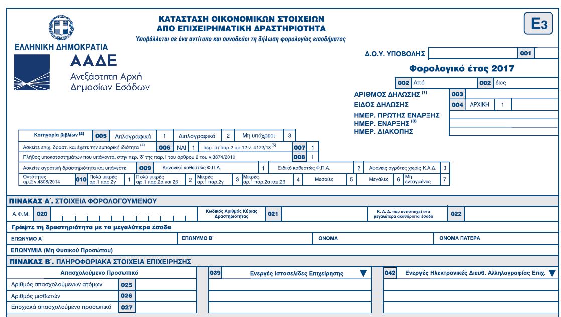 Η Ανεξάρτητη Αρχή Δημοσίων Εσόδων (AAΔΕ), προχώρησε στον ανασχεδιασμό του εντύπου Ε3 προκειμένου να προσαρμοστεί στις διατάξεις περί Ελληνικών Λογιστικών Προτύπων του ν.4308/2014, καθώς και για να αποτυπωθούν σε αυτό με πληρέστερο τρόπο τα αποτελέσματα και το σύνολο των οικονομικών πληροφοριών των επιχειρήσεων.