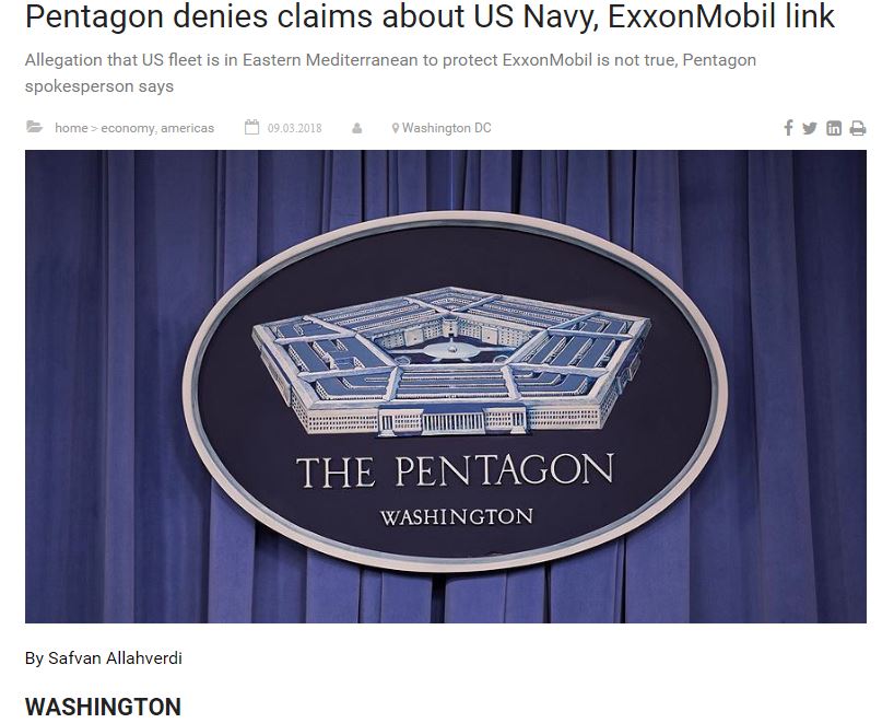 «Τους ισχυρισμούς πως οι ναυτικές δυνάμεις των ΗΠΑ αναπτύχθηκαν στην Ανατολική Μεσόγειο για να προσφέρουν προστασία στις έρευνες για εξόρυξη που πραγματοποιεί η Exxon αρνείται το αμερικανικό Πεντάγωνο» σύμφωνα με τα τουρκικά ΜΜΕ.