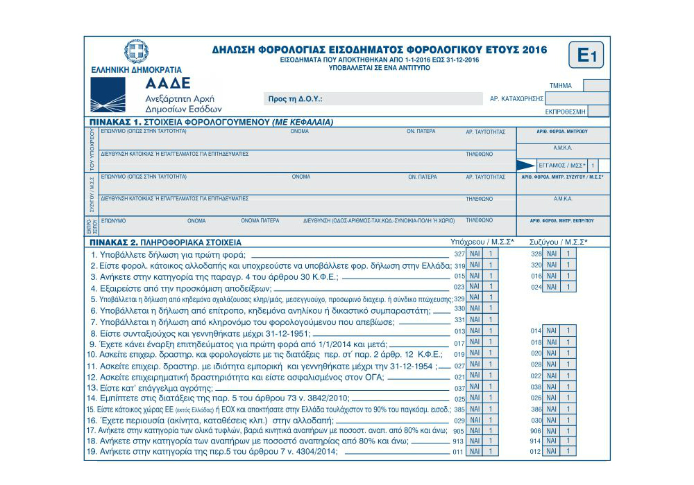 Τα νέα στοιχεία που θα δουν οι φορολογούμενοι στο βασικό έντυπο της φορολογικής δήλωσης, το γνωστό Ε1, είναι τα εξής: