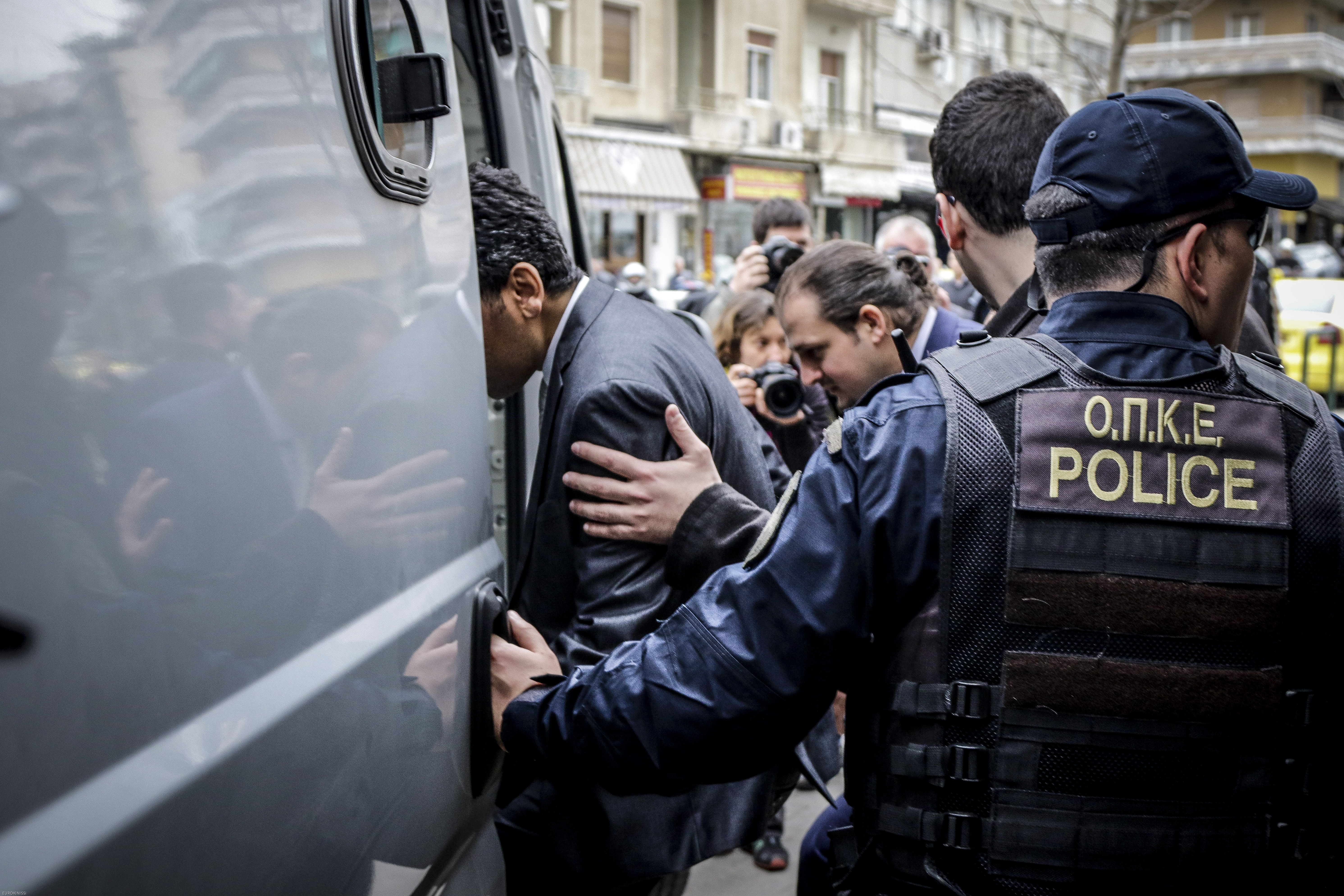 According to the arrest warrant issued by Turkish authorities, the eight are accused of plotting to overthrow the Turkish government or impeding it from carrying out its mission, of attempting to abolish the Turkish Grand National Assembly (parliament), of an attempt to overturn the constitutional order, of participation in an armed terrorist organisation, and of attempted murder, deserting and going to a foreign country, theft of military equipment and incurring damage on materiel.