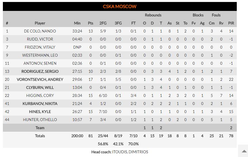 Κορυφαίος της ΤΣΣΚΑ ο Αντρέι Βοροντσέβιτς με 17 πόντους και ποσοστά ευστοχίας για… όσκαρ (1/1 δίποντα, 5/5 τρίποντα), ενώ τον ακολούθησαν σε απόδοση οι Κόρι Χίγκινς (15π.), Κάιλ Χάινς (15π.) και ο ήρωας του αγώνα, Νάντο Ντε Κολό (13π., 8ασ.).
